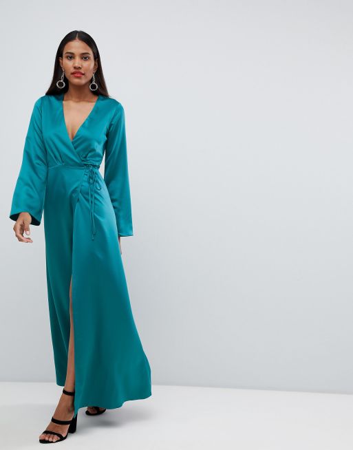 Asos Design Wrap Satin Maxi Dress With Long Sleeve Asos